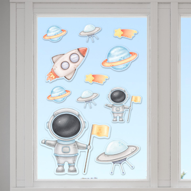 Εξαιρετικά διάφανα αυτοκόλλητα τζαμιού Αστροναύτης, κατασκευασμένα από υλικό υψηλής ποιότητας. Ανανεώστε την ατμόσφαιρα σας με τα αυτοκόλλητα τζαμιού Αστροναύτης! Δώστε ζωντάνια στον χώρο σας με την αγαπημένη σας θεματολογία