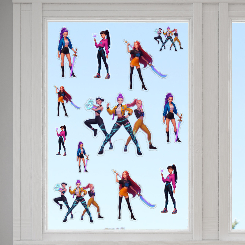 Εξαιρετικά διάφανα αυτοκόλλητα τζαμιού K-Pop Demon Hunters, κατασκευασμένα από υλικό υψηλής ποιότητας. Ανανεώστε την ατμόσφαιρα σας με τα αυτοκόλλητα τζαμιού K-Pop Demon Hunters! Δώστε ζωντάνια στον χώρο σας με την αγαπημένη σας θεματολογία