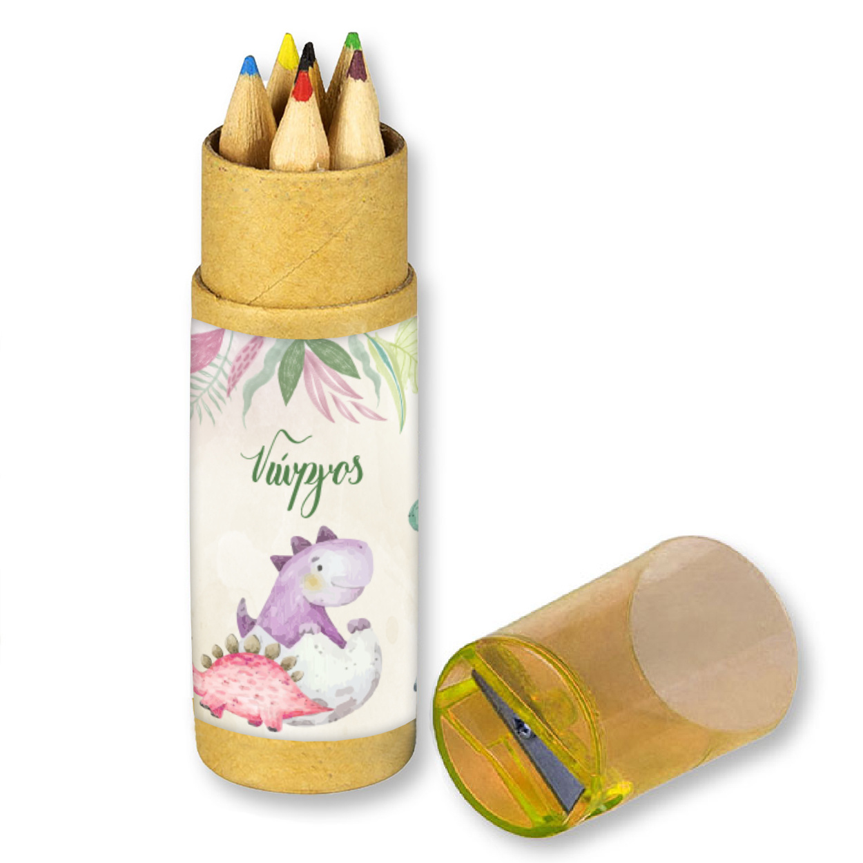 Σετ Ξυλομπογιές 6τμχ με ξύστρα Baby Dino με όνομα ένα υπέροχο δωράκι για τους μικρούς μας φίλους. Για την Βάπτιση και το Πάρτι σας.