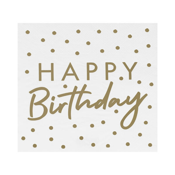 Χαρτοπετσέτες ‘HAPPY BIRTHDAY’ σε λευκό φόντο με χρυσά γράμματα και spots.