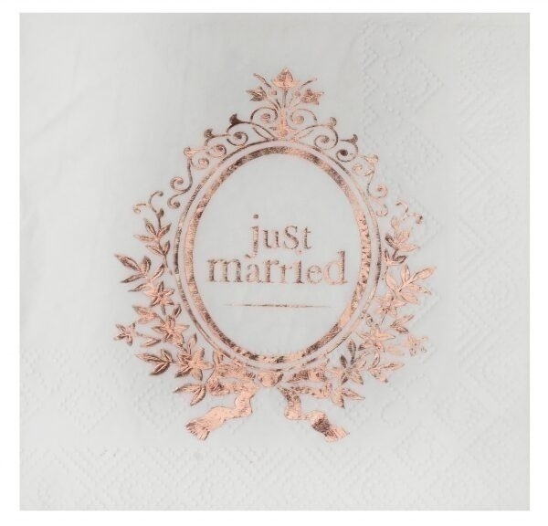 Χάρτινες πετσέτες γλυκού μεγέθους 25Χ25εκ. Λευκές με Ρόζ Χρυσό “Just Married”