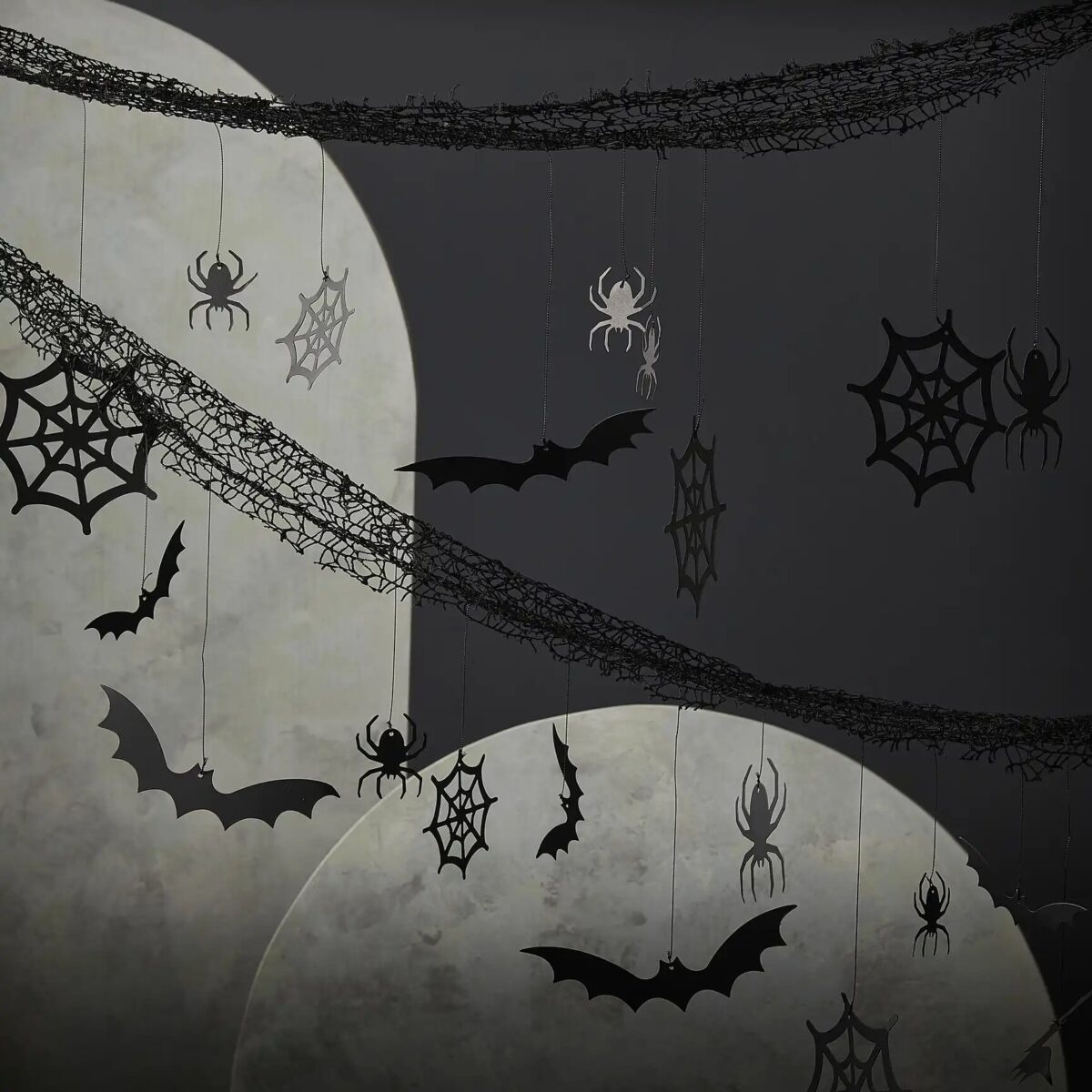 Δημιουργήστε μια ανατριχιαστική ατμόσφαιρα στο Halloween πάρτι σας με το σκηνικό με κρεμαστές αράχνες, νυχτερίδες και ιστούς αράχνης.