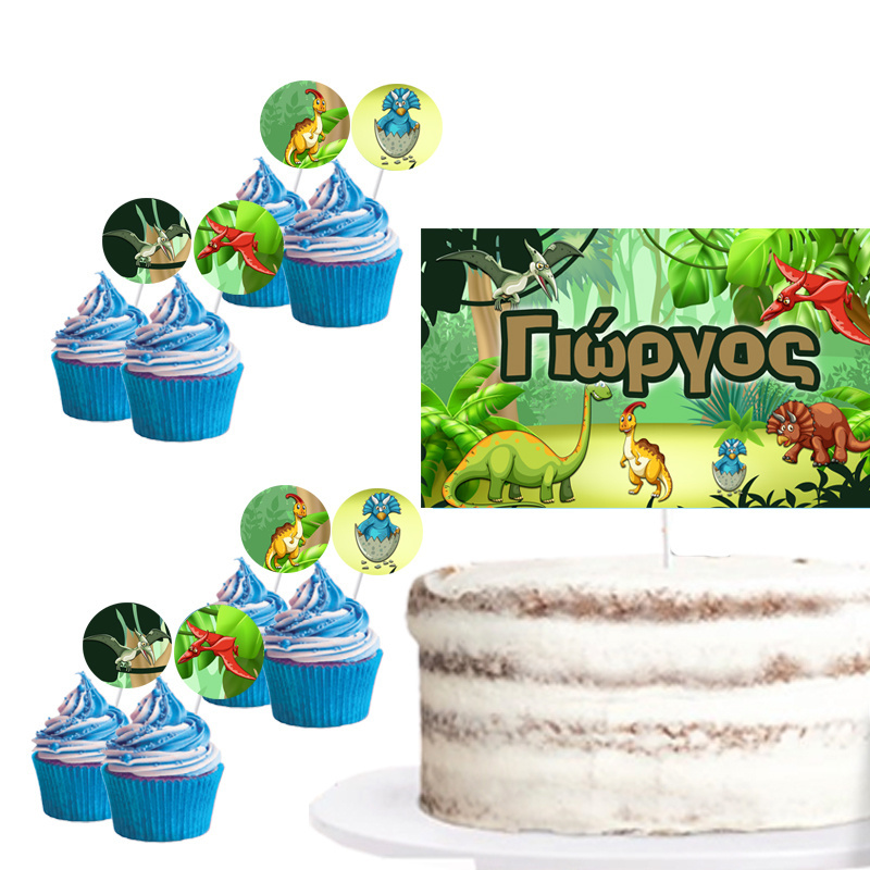 Δώστε μια εντυπωσιακή νότα στην τούρτα σας με τη διακόσμηση τούρτας θέμα Δεινόσαυροι και τα cupcake toppers! Κατασκευασμένα από χαρτί Illustration 300gr, εξατομικευμένα με το όνομα της επιλογής σας.Αναβαθμίστε το πάρτυ σας με μια μοναδική διακόσμηση!