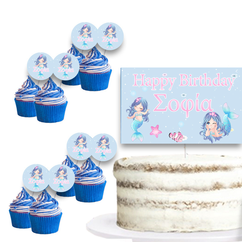 Διακόσμηση τούρτας με θέμα την λατρεμένη γοργόνα & 8 topper cupcakes με το όνομα σου.