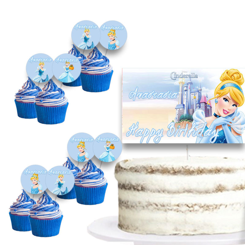 Διακόσμηση τούρτας με θέμα την Σταχτοπούτα & 8 topper cupcakes με το όνομα σου.