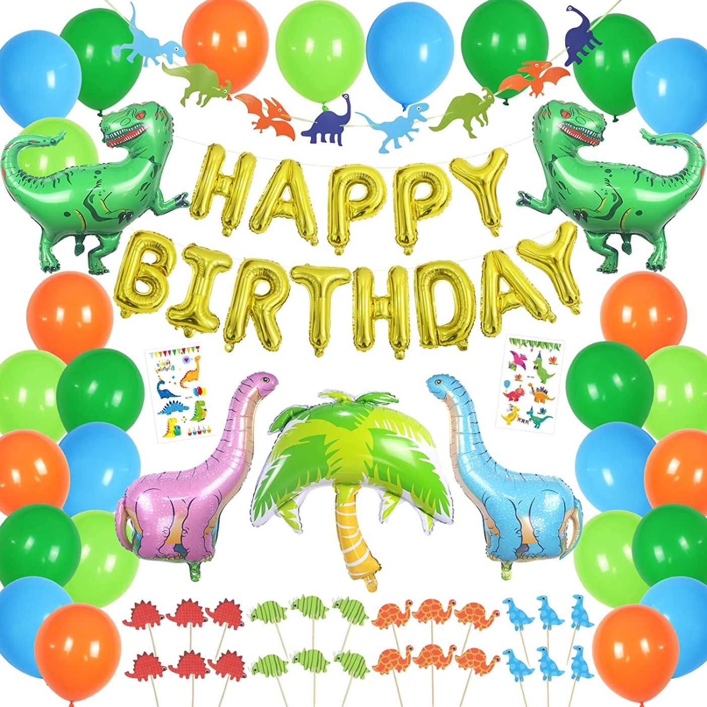 Ένα σετ πάρτυ με μεγάλους δεινόσαυρους. Τα μικρά παιδιά θα ενθουσιαστούν.