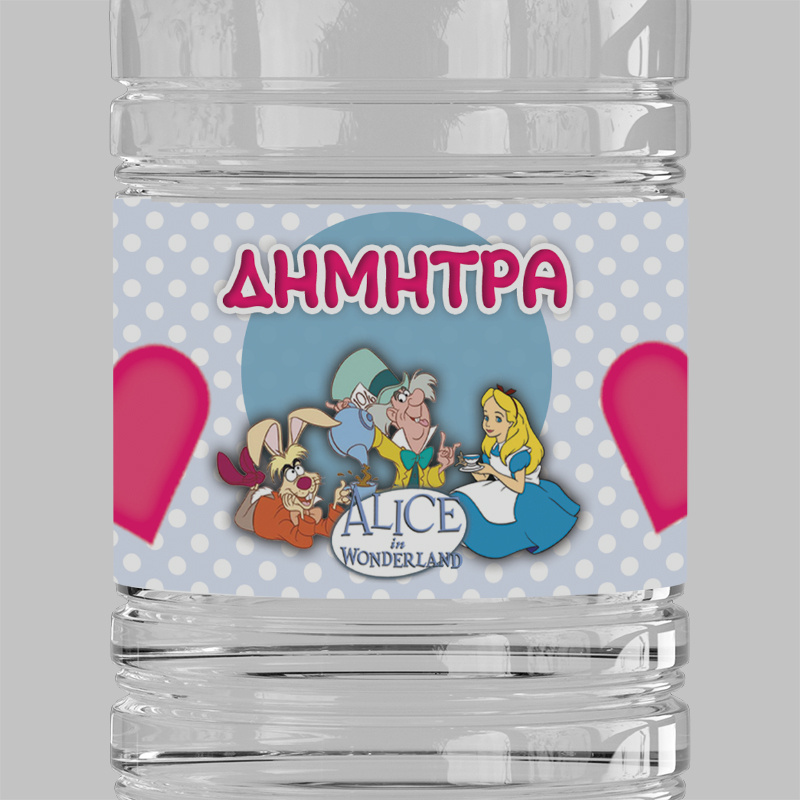 Προσωποποιημένες ετικέτες για μπουκαλάκια νερού με θέμα την Αλίκη στη Χώρα των Θαυμάτων.