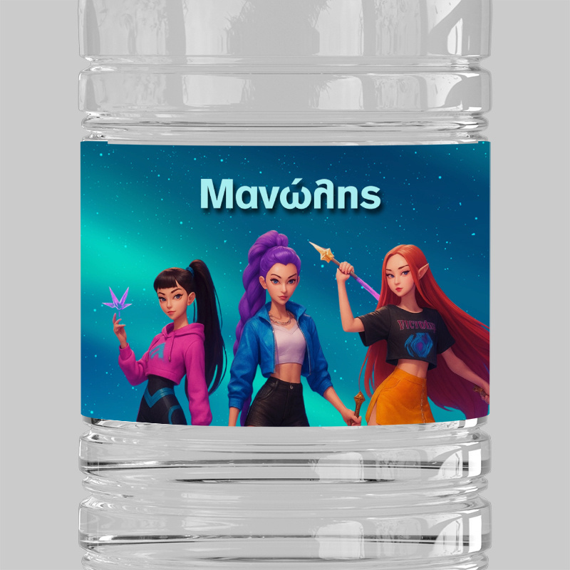 Προσωποποιημένες ετικέτες για μπουκαλάκια νερού με θέμα K-Pop Demon Hunters.