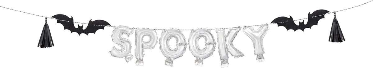 Γιρλάντα με φοιλ γράμματα “SPOOKY” μεγέθους 12εκ. φουσκωμένα, 2 μαύρες φούντες , 2 χάρτινες νυχτερίδες και σπάγκο 3,65μ