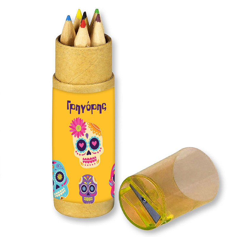 Σετ Ξυλομπογιές 6τμχ με ξύστρα Halloween Νεκροκεφαλές με όνομα ένα υπέροχο δωράκι για τους μικρούς μας φίλους. Για την Βάπτιση και το Πάρτι σας.