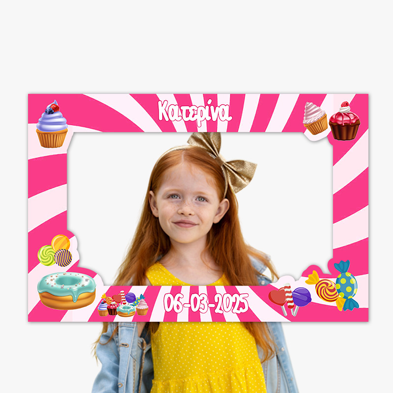 Προσωποποιημένο κάδρο Photobooth με θέμα Sweet Shop, για να φωτογραφηθείτε μαζί με τους καλεσμένους σας.