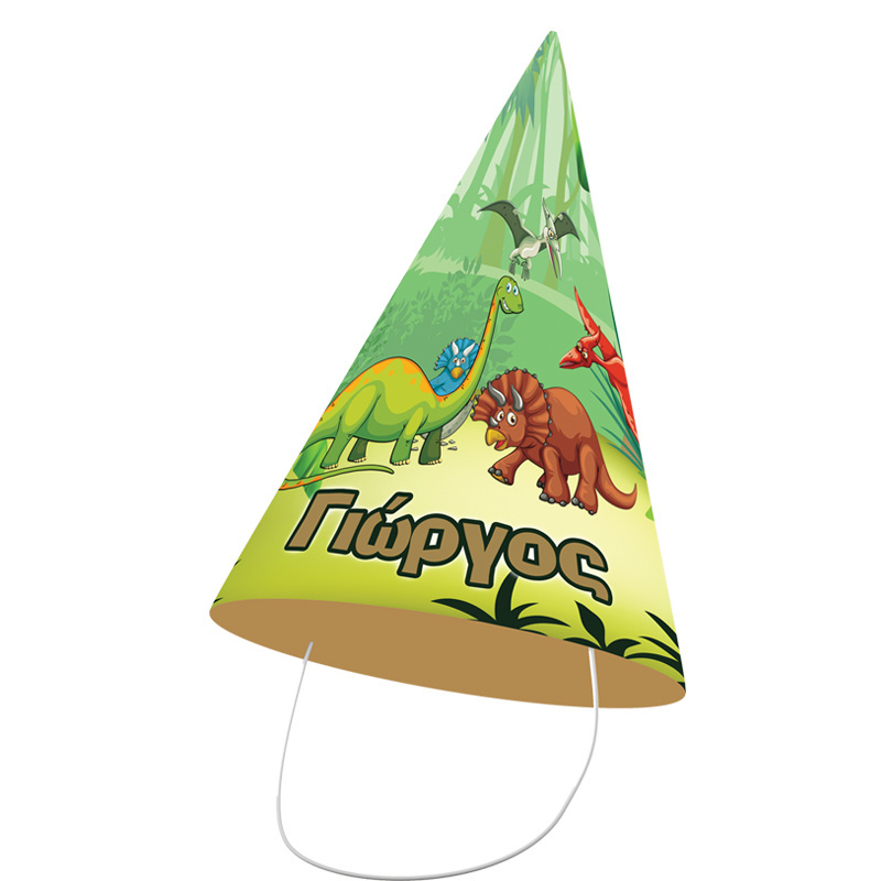 “Ξεκινήστε το Roar Party με θεματικά καπελάκια πάρτυ Δεινόσαυροι! Κατασκευασμένα από χαρτί Illustration 300gr και εξατομικευμένα με το όνομα της επιλογής σας.