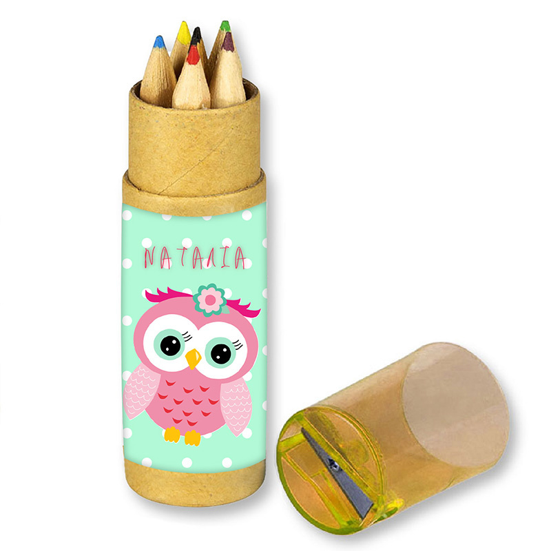 Σετ Ξυλομπογιές 6τμχ με ξύστρα Κουκουβάγιες με όνομα ένα υπέροχο δωράκι για τους μικρούς μας φίλους. Για την Βάπτιση και το Πάρτι σας.