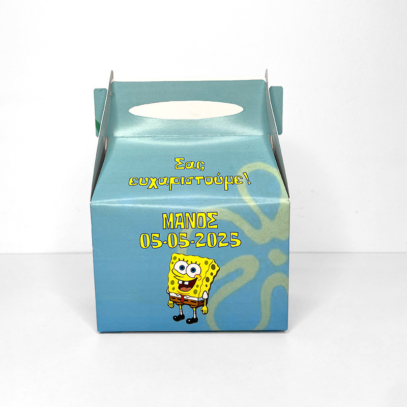 Χάρτινο κουτί Μπομπ Σφουγγαράκης για συσκευασία δώρου σε βάπτιση και πάρτυ.
