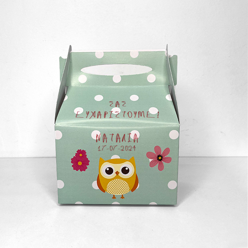 Χάρτινο κουτί Κουκουβάγια για συσκευασία δώρου σε βάπτιση και πάρτυ.