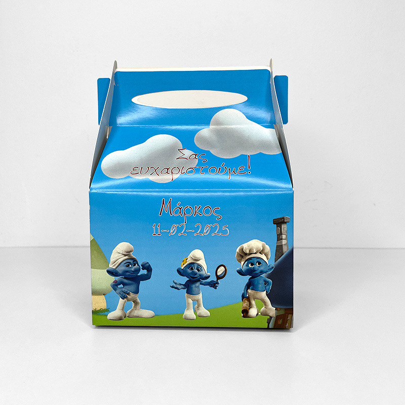 Χάρτινο κουτί Στρουμφάκια για συσκευασία δώρου σε βάπτιση και πάρτυ.
