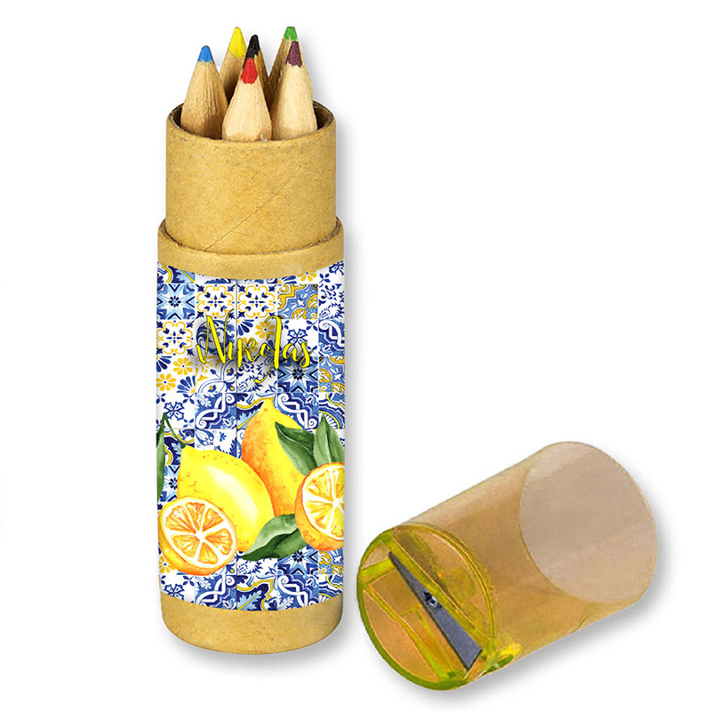 Σετ Ξυλομπογιές 6τμχ με ξύστρα Λεμόνι με όνομα ένα υπέροχο δωράκι για τους μικρούς μας φίλους. Για την Βάπτιση και το Πάρτι σας.