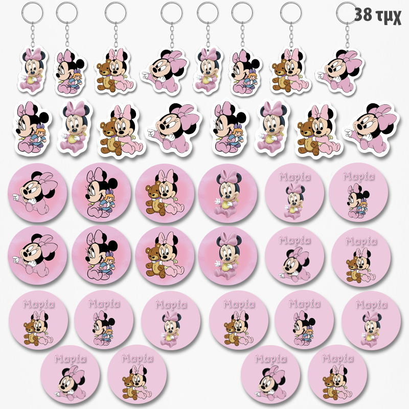 Πακέτο δωράκια Baby Minnie για πάρτυ ή Βάπτιση αποτελείται από 38 τεμάχια που θα φέρουν απόλυτη διασκέδαση και χαρά στους μικρούς σας φίλους.