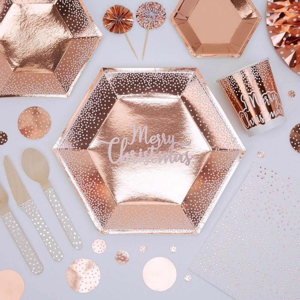 Πιάτα χαρτ. φαγητού Merry Christmas 27εκ Ροζ Χρυσό με Λευκά Πουα /8 τεμ