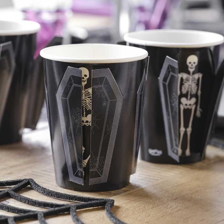 8 x 266ml Halloween ποτήρια με μαύρο σκελετό σε pop out φέρετρο.