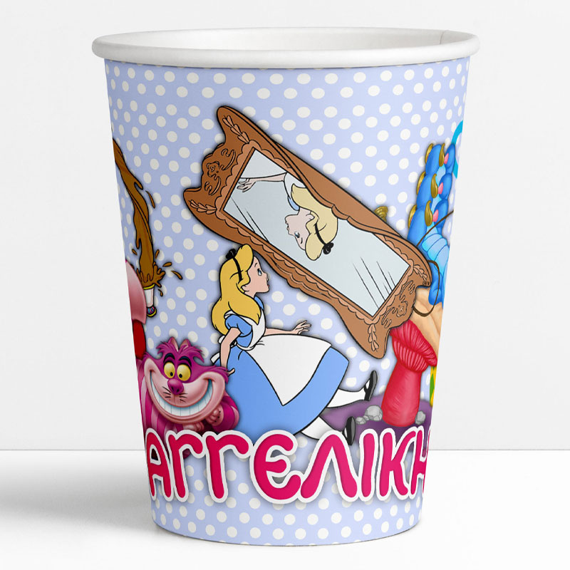 Θεματικά χάρτινα ποτηράκια Αλίκη στη χώρα των θαυμάτων με όνομα.
