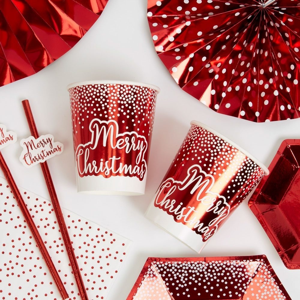 Ποτήρια χαρτ. 266ml Κόκκινο με Λευκά Πουα Merry Christmas /8 τεμ