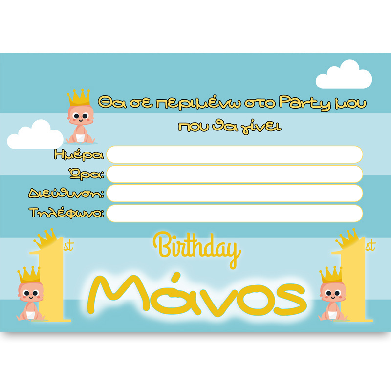 Προετοιμαστείτε για ένα αξέχαστο πάρτυ για τα πρώτα γενέθλια με τις προσκλήσεις 1st Birthday boy. Καλέστε τους αγαπημένους σας να γιορτάσουν μαζί σας και μην ξεχάσετε να μας στείλετε το όνομά σας.