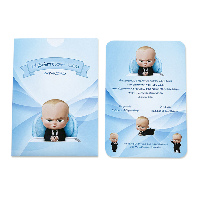 Προσκλητήριο βάπτισης Baby Boss, με συρταρωτό εκτυπωμένο φάκελο.