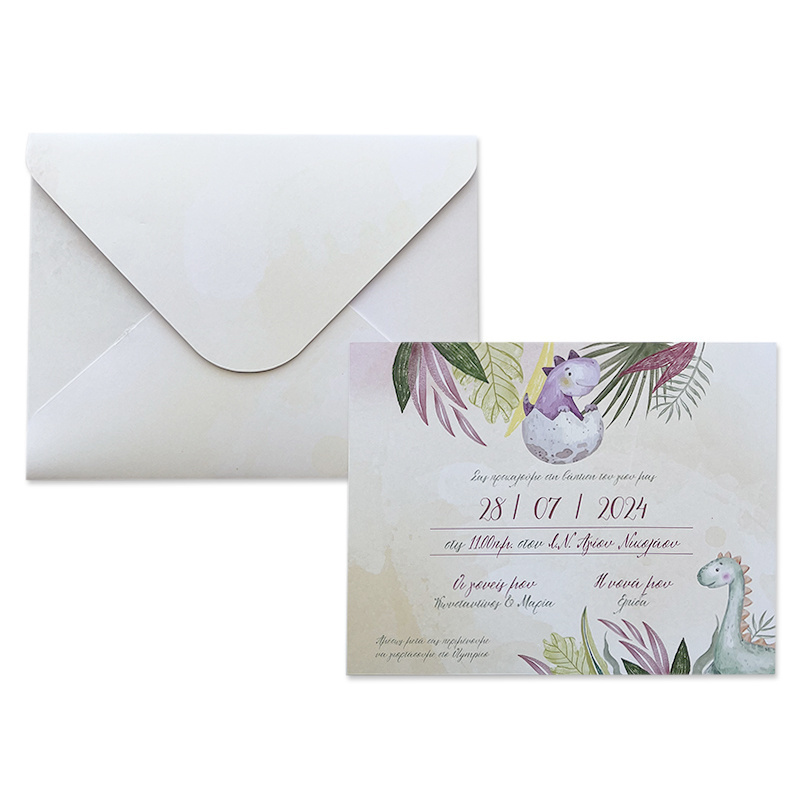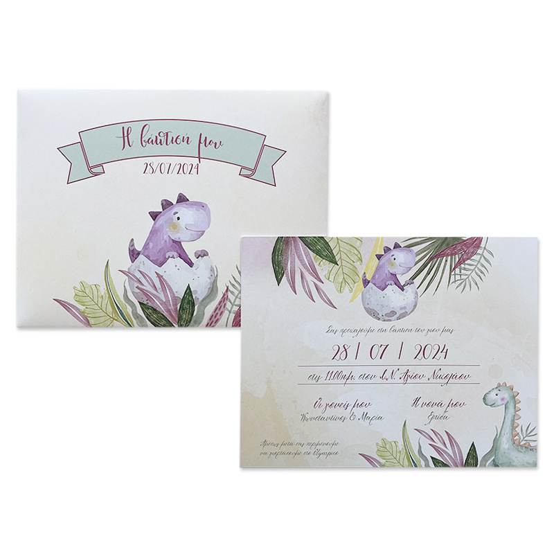 Προσκλητήριο βάπτισης Baby Dino, με εκτυπωμένο φάκελο.