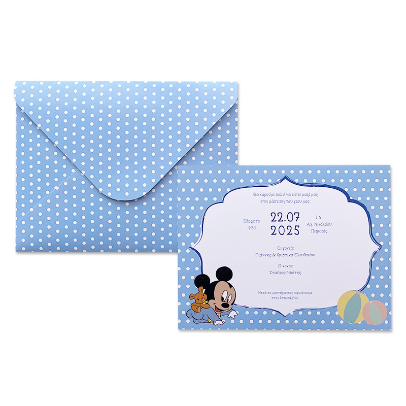 Προσκλητήριο βάπτισης Baby Mickey, με εκτυπωμένο φάκελο.