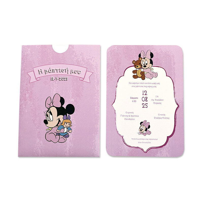 Προσκλητήριο βάπτισης Baby Minnie, με συρταρωτό εκτυπωμένο φάκελο.