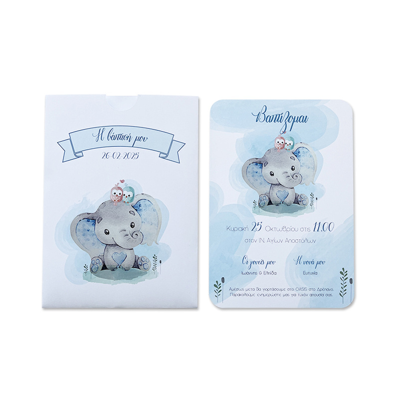 Προσκλητήριο βάπτισης Μπαλαρίνα Ελεφαντάκι για Αγόρι, με συρταρωτό εκτυπωμένο φάκελο.