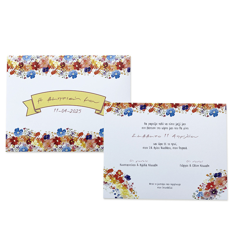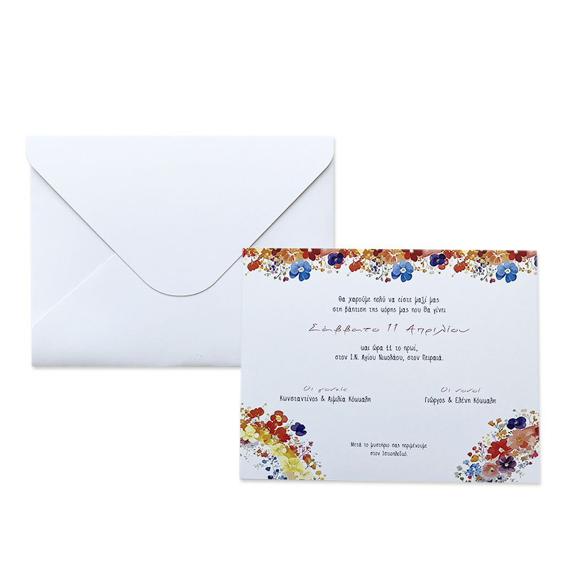 Προσκλητήριο βάπτισης Floral, με εκτυπωμένο φάκελο.