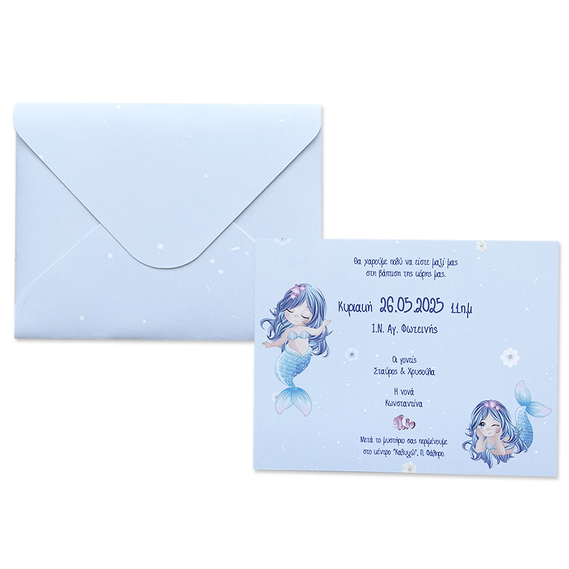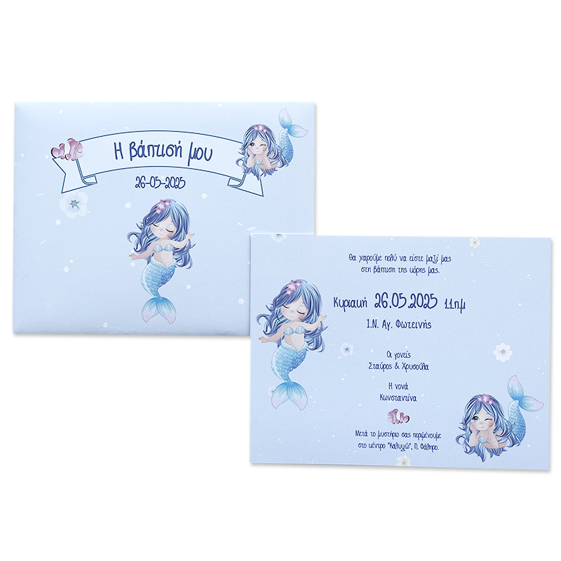 Προσκλητήριο βάπτισης Γοργόνα, με εκτυπωμένο φάκελο.