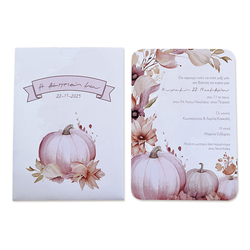Προσκλητήριο βάπτισης Μπαλαρίνα Κολοκύθα, με συρταρωτό εκτυπωμένο φάκελο.