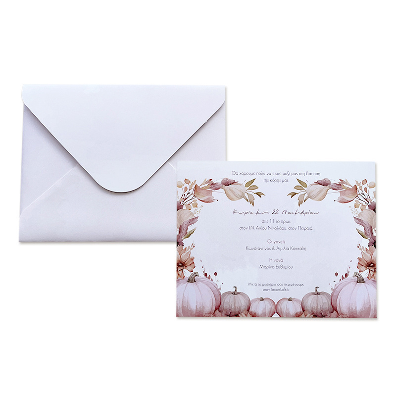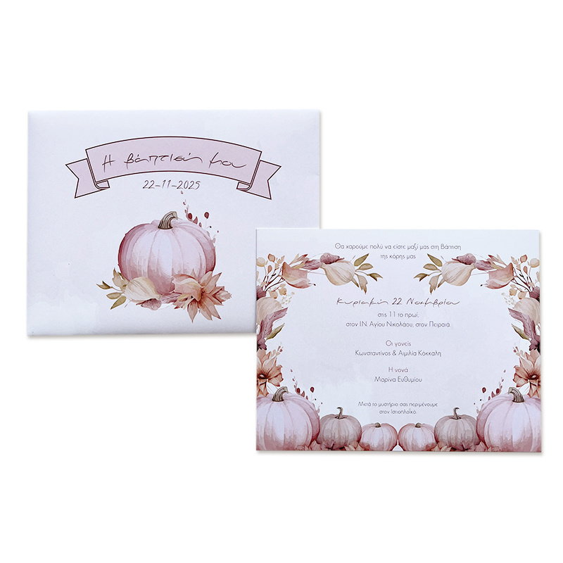 Προσκλητήριο βάπτισης Κολοκύθα, με εκτυπωμένο φάκελο.