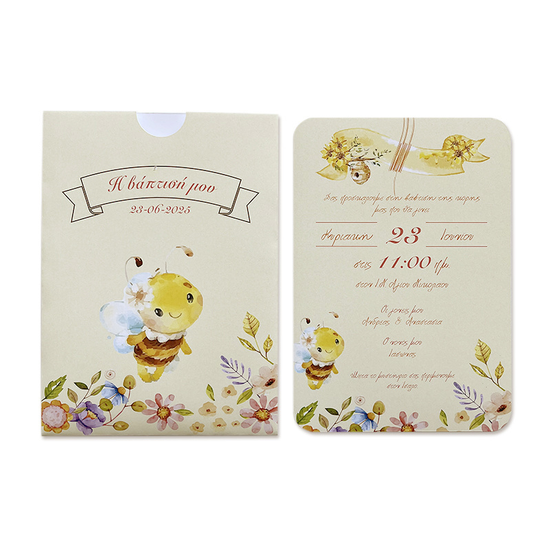 Προσκλητήριο βάπτισης Μέλισσα, με συρταρωτό εκτυπωμένο φάκελο.