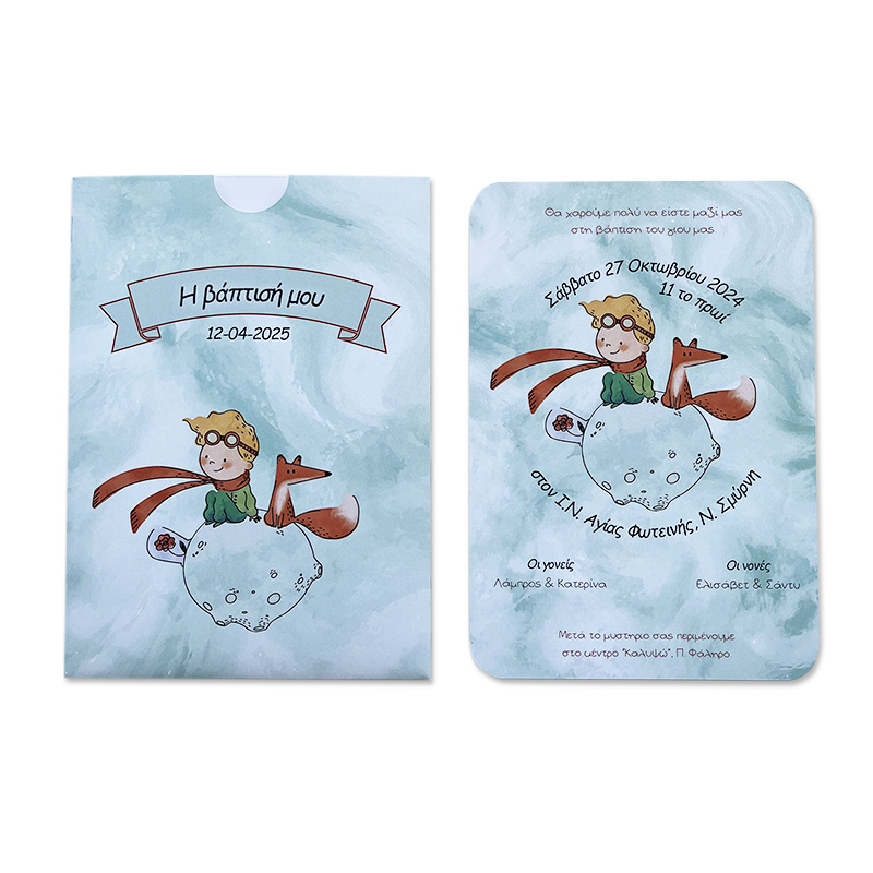 Προσκλητήριο βάπτισης Ο Μικρός Πρίγκιπας, με συρταρωτό εκτυπωμένο φάκελο.
