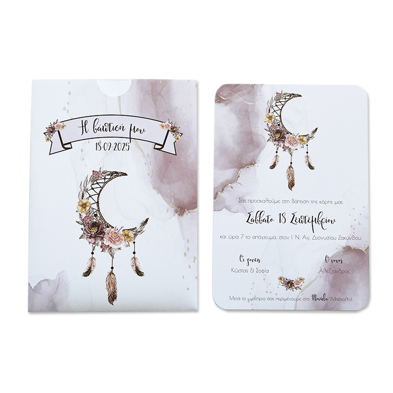 Προσκλητήριο βάπτισης Ονειροπαγίδα για Κορίτσι, με συρταρωτό εκτυπωμένο φάκελο.