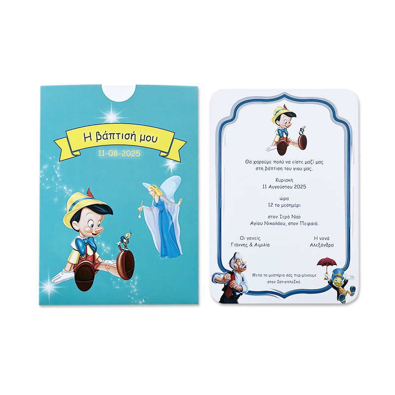 Προσκλητήριο βάπτισης Πινόκιο, με συρταρωτό εκτυπωμένο φάκελο.