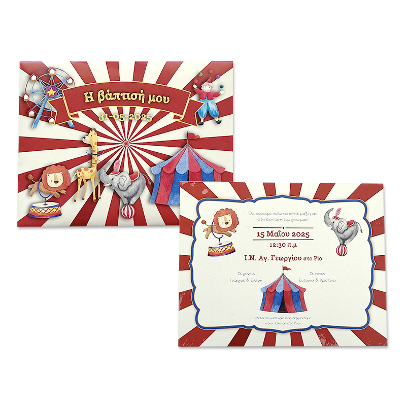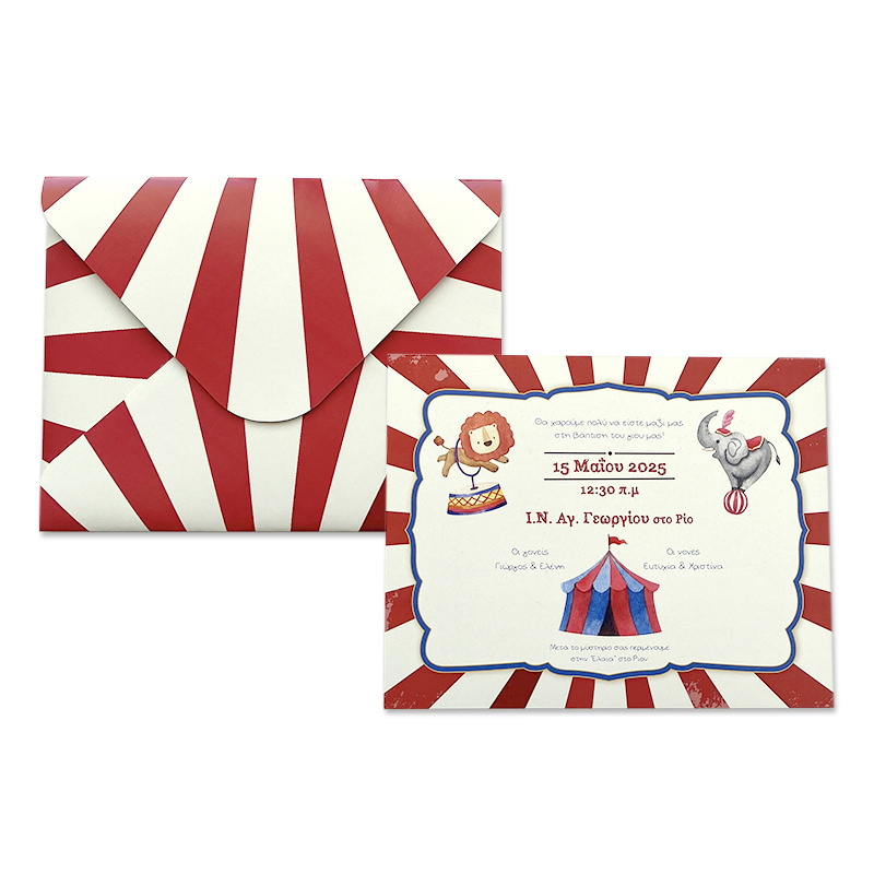 Προσκλητήριο βάπτισης Τσίρκο, με εκτυπωμένο φάκελο.