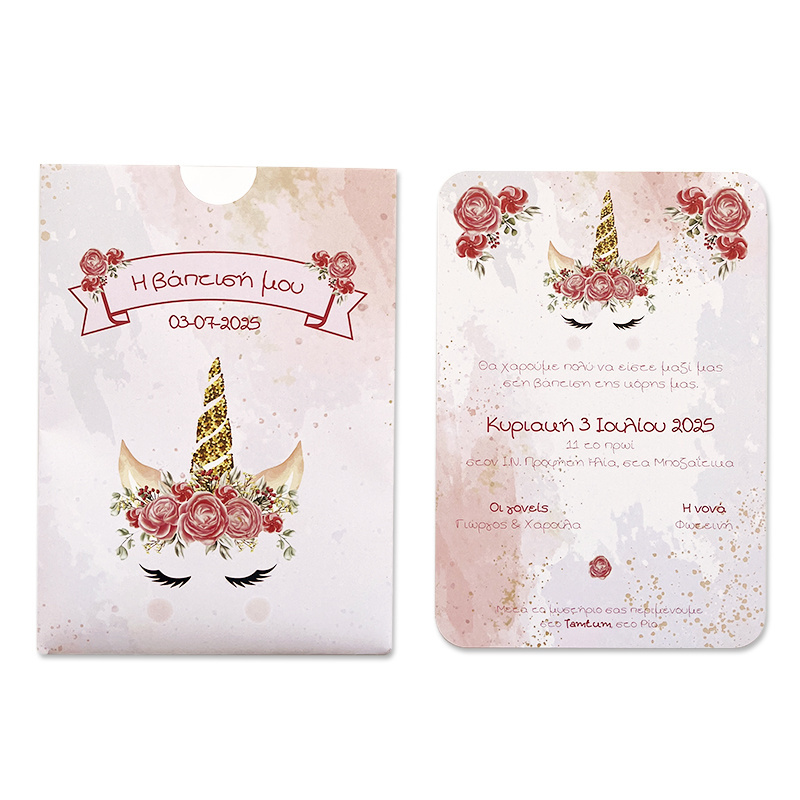 Προσκλητήριο βάπτισης Unicorn, με συρταρωτό εκτυπωμένο φάκελο.