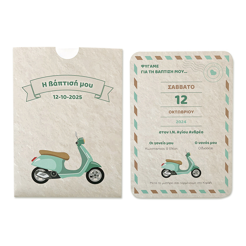 Προσκλητήριο βάπτισης Βέσπα, με συρταρωτό εκτυπωμένο φάκελο.