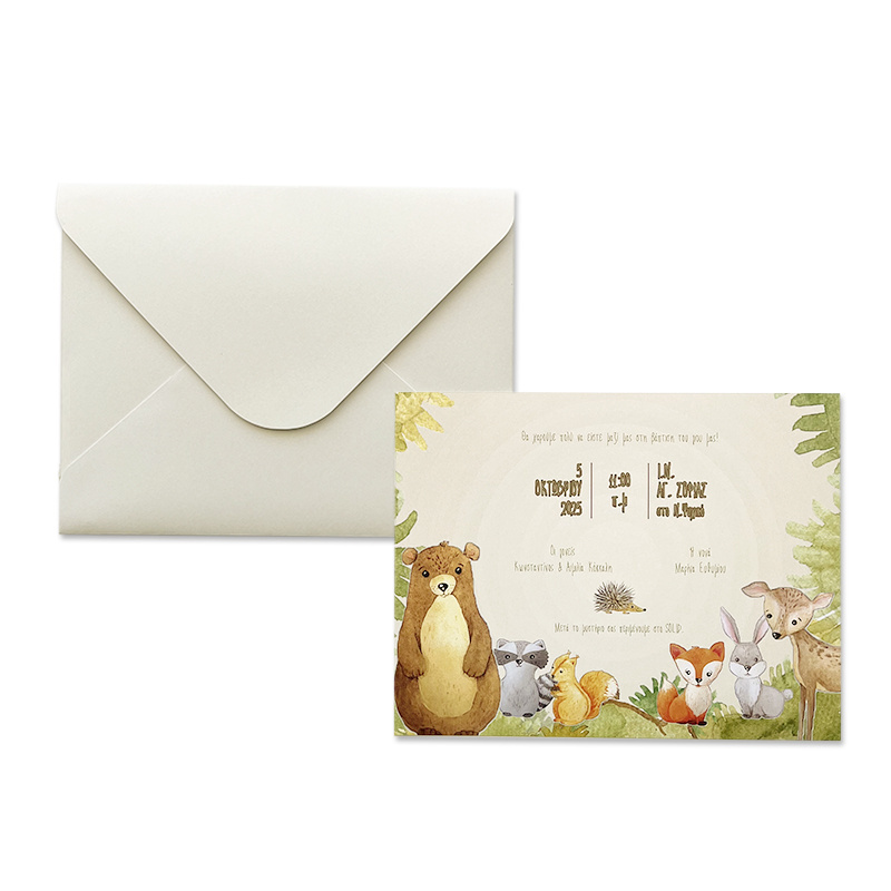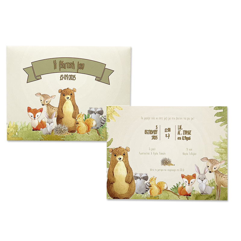 Προσκλητήριο βάπτισης Ζώα Δάσους, με εκτυπωμένο φάκελο.