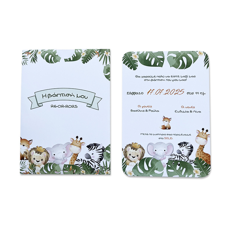 Προσκλητήριο βάπτισης Ζώα Ζούγκλας, με συρταρωτό εκτυπωμένο φάκελο.