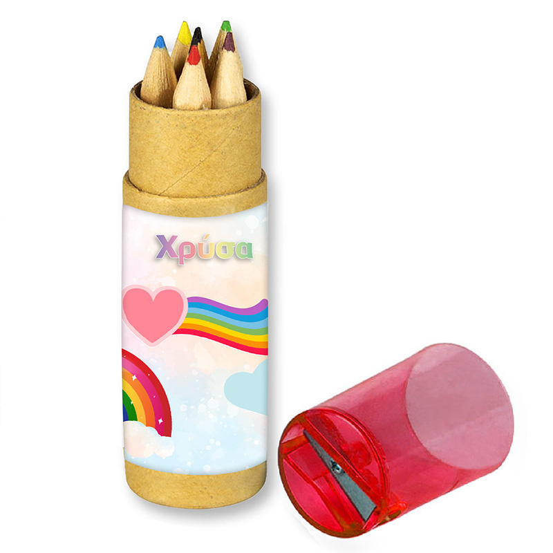 Σετ Ξυλομπογιές 6τμχ με ξύστρα Rainbow με όνομα ένα υπέροχο δωράκι για τους μικρούς μας φίλους. Για την Βάπτιση και το Πάρτι σας.