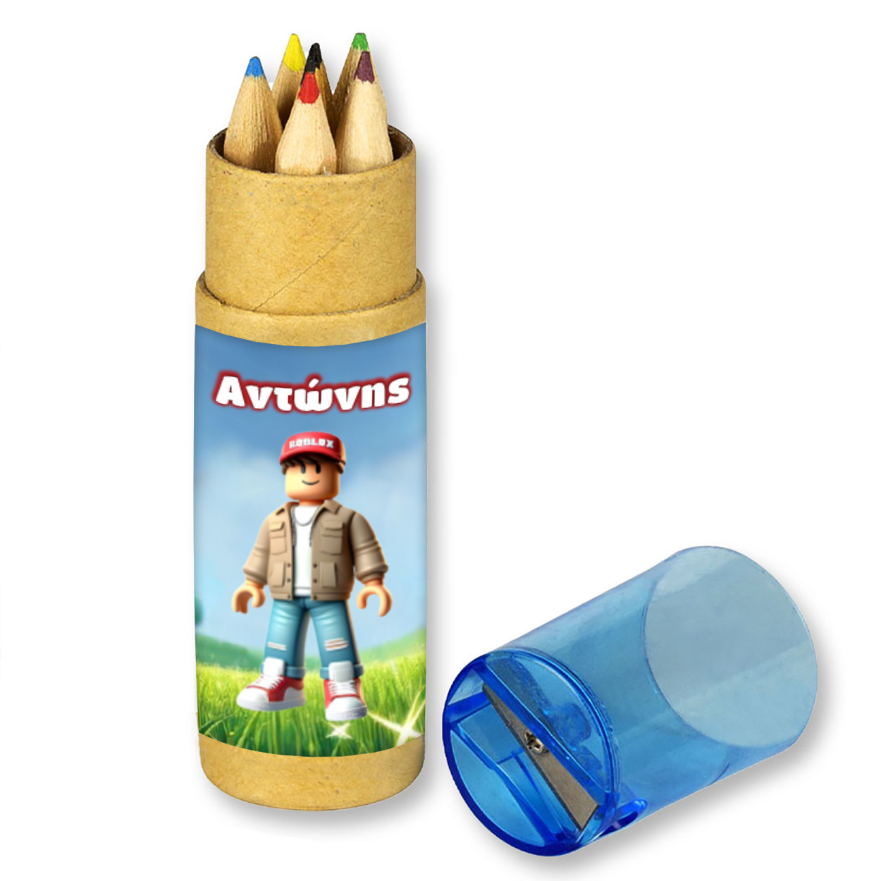 Σετ Ξυλομπογιές 6τμχ με ξύστρα Roblox με όνομα ένα υπέροχο δωράκι για τους μικρούς μας φίλους. Για την Βάπτιση και το Πάρτι σας.
