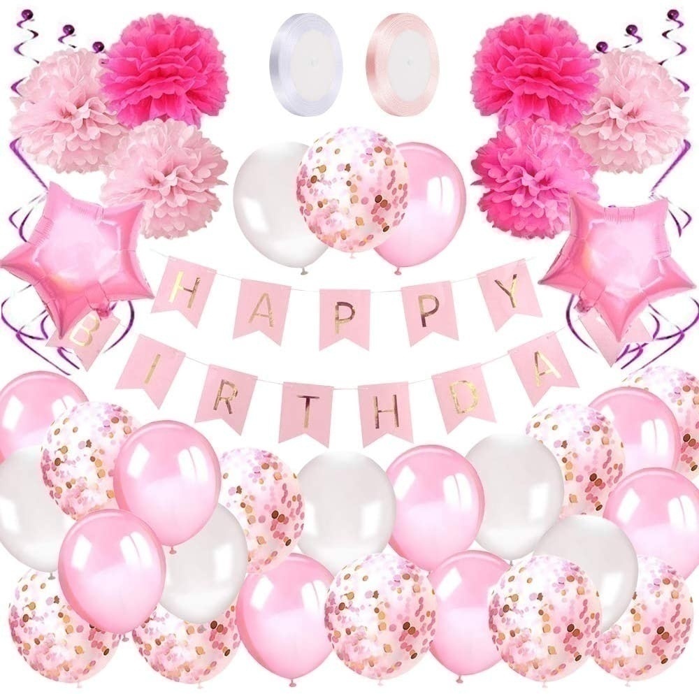 Σετ Πάρτυ Διακόσμησης “Pink Birthday”. Μπορείτε να σκάσετε τα μπαλόνια για να αφήσετε το κομφετί για να κάνετε το πάρτι σας πιο χαρούμενο και ρομαντικό!