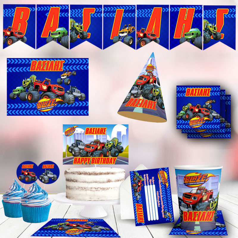 Ένα ολοκληρωμένο σετ πάρτυ με τον Blaze, μπορείς να γράψεις το όνομα σου, επάνω σε όλα τα προϊόντα του σετ.
