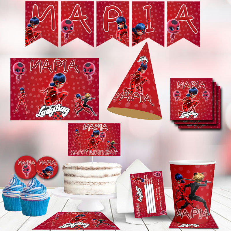 Ένα ολοκληρωμένο σετ πάρτυ με την Miraculous LadyBug, μπορείς να γράψεις το όνομα που επιθυμείς πάνω στα είδη πάρτυ!
